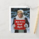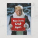 A humourous holiday image featuring a Donald Trump dressed in a Santa suit, holding a red sign that reads, “Make Christmas Great Again.” Snowflakes fall around him, adding to the festive winter atmosphere. The text and expression convey a blend of seasonal spirit and a lighthearted nod to political slogans