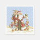 This paper napkin has a cute Santa Claus walking in the falling snow holding a lit lantern surrounded by happy children.
