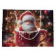 A charming and whimsical image depicting a miniature Santa Claus nestled inside a giant, steaming mug of hot cocoa. The mug is adorned with delicate snowflakes and dripping with creamy goodness. Santa, with his rosy cheeks and twinkling eyes, peeks out from the warmth, surrounded by the soft glow of Christmas lights and festive decorations.