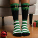 Get dressed up this Christmas with these cool elf socks! Featuring a fun design of a black Santa Claus helper elf outfit and green striped socks, these socks are perfect for holiday parade costumes and festive cosplay.