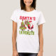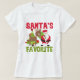 Cute, colourful Christmas holiday design T-shirts featuring red and green text that reads Santa's Favourite, and Santa Claus, a Christmas tree, and a reindeer!