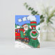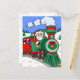 Cute illustration of Santa as the engineer of his Christmas train. Bright fun colours.