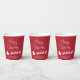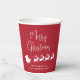 Fun seasonal red and white paper cups for your Christmas holiday parties and table decor featuring reindeers flying Santa's sleigh through air, "Merry Christmas" in a modern script and your name or event in simple typography.