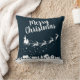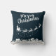 This elegant blue Christmas pillow features the silhouette of Santa's sleigh with his reindeers, flying above the houses in a trail of stars.