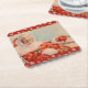 Here comes Santa Claus through snow and blizzard on Christmas paper coaster with red background.