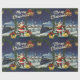 This festive wrapping paper is perfect for adding a touch of traditional Christmas charm to your gifts! It features a repeating pattern on a deep blue, snowy background. Each section includes a classic Santa Claus holding a glowing lantern, a vintage-style steam train chugging through a snowy village with quaint houses and pine trees, and a "Merry Christmas" script intertwined with holly and jingle bells. The overall design evokes a nostalgic, magical winter wonderland feel, ideal for holiday presents.