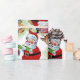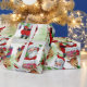 This vibrant, repeating pattern has a distinct mid-century illustration style set against a light, speckled green and white background. It features several vignettes of classic Santa Claus engaging in holiday preparations, such as sitting on a stool painting an ornament, standing with a large sack of gifts, and preparing to go down a chimney, often accompanied by a gentle reindeer. Interspersed between the Santa figures are detailed sprigs of holly or pine branches tied with red bows and featuring candy canes and small ornaments, creating a busy yet cheerful festive scene.