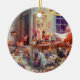 A beautiful vintage ornament featuring Santa with his elves in the workshop.