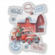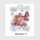 A vintage red truck, loaded with beautifully wrapped gifts, stands proudly in front of a charming red barn designed like Santa's workshop. Seasonal snowflakes surround the scene, evoking a magical Christmas atmosphere filled with joy and cheer.