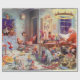 Charming vintage wrapping paper featuring Santa with his elves in the workshop.