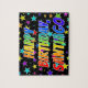 This lively, vibrant, birthday-themed jigsaw puzzle design has the message "HAPPY BIRTHDAY, SANTIAGO" with the characters having a colourful rainbow spectrum inspired gradient pattern, in addition to an exciting star field background pattern. A colourful puzzle like this might be used to send a birthday greeting message to somebody named Santiago. [~Z0000468]