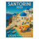 Travel poster design titled "Santorini 2025 – Escape to the Aegean", showcasing the iconic village of Oia on Santorini Island under bright midday sunlight. Whitewashed houses with blue domes cascade down the cliffs, overlooking the sparkling turquoise waters of the Aegean Sea.