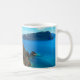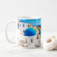 Glossy ceramic coffee mug featuring Santorini, Cyclades, Greece—whitewashed architecture with blue domes above the turquoise Aegean Sea under a crisp summer sky; perfect for travel lovers and coastal décor.