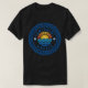 Santorini, Greece summer sunshine and sea design men's black T-shirt. This design features a Greek pattern style circle with a graphic of sunshine and sea with the words "Santorini" and "Greece" in curved text and the national flag of Greece as part of the design. This summer design is great if you are planning a trip to this beautiful Greek island or to give as a gift to someone who will enjoy it.