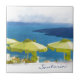 Cocktails by the Sea. Colourful watercolor painting of a restaurant in Santorini Greece. Bright green umbrellas against beautiful blue of the Aegean sea. Mediterranean colours. Add some vacation paradise to your kitchen with this tile.