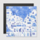 A modern blue and white watercolor painting of the Greek island of Santorini.
