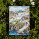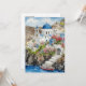 This postcard features a watercolor portrait of Santorini, Greece.