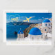 Save the Date 5x7 postcard with real gold, silver, or rose gold foil accents for a Santorini, Greece Destination Wedding featuring the classic blue and white dome buildings shoreline and a fun and creative travel theme destination wedding logo with initials and wedding date inside an airplane heart trail design.