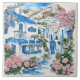 Santorini Watercolor Houses & Pink Flowers Ceramic Tile