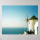 Watercolour-style image of a windmill on the edge of the caldera in Oia, on the Greek island of Santorini
