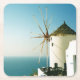 Watercolour-style image of a windmill on the edge of the caldera in Oia, on the Greek island of Santorini