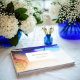This is a colourful abstract art wedding guest book with a vibrant design featuring shades of sapphire blue and citrus orange. It has a formal serif font and a modern handwritten script font. Easily edit the template to your desired details. Sapphire Blue Abstract Wedding Guest Book.