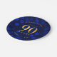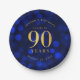 Chic 90th Birthday paper plate featuring the words "Cheers to 90 Years" in faux gold foil against a sapphire blue bokeh lights pattern background.