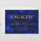 Classy engagement party invitation featuring the words "Engaged!" in faux gold foil against a sapphire blue bokeh lights pattern background. Invitation has a blue colour background back side.