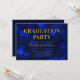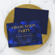 Chic graduation party invitation featuring the words "Graduation Party" in faux gold foil against a sapphire blue bokeh pattern background. Invitation has a dark blue background back side.