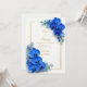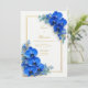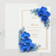 Surround your celebration details with the vivid energy of this striking sapphire blue botanical design. The artwork features lush clusters of royal blue orchids anchored in opposite corners, their deep jewel-tone petals accented by delicate azure filler blossoms and tiny yellow-tipped centers. A thin, elegant double gold frame encloses the composition, providing a luxurious metallic contrast against the crisp, minimalist white background. The interplay of bold saturated color and clean negative space creates a high-end, contemporary aesthetic for your special event. This design is a premier choice for a formal summer garden ceremony, a vibrant nautical-inspired beachfront wedding, or a sophisticated luxury gala. It is perfectly suited for couples planning a "Sapphire and Gold" or "Modern Botanical" wedding theme. The bold, regal tones make it an ideal match for upscale venues like a modern art gallery, a historic yacht club, or a grand ballroom where vibrant color and refined metallic accents set a tone of prestige and artistic romance.
