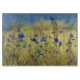 Vivid blue chicory and cornflowers bloom in a golden field of grass under a pale blue sky. The blonde and green background is also interrupted by the sparkling pink of muhly grass flowers.