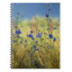Vivid blue chicory and cornflowers bloom in a golden field of grass under a pale blue sky. The blonde and green background is also interrupted by the sparkling pink of muhly grass flowers.