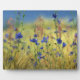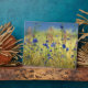 Vivid blue chicory and cornflowers bloom in a golden field of grass under a pale blue sky. The blond and green background is also interrupted by the sparkling pink of muhly grass flowers.
