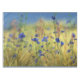 Vivid blue chicory and cornflowers bloom in a golden field of grass under a pale blue sky. The blonde and green background is also interrupted by the sparkling pink of muhly grass flowers.