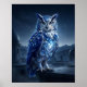 A majestic sapphire owl perches within a celestial observatory, its body formed from luminous blue crystal and faceted gemstone textures that shimmer with deep cosmic light. Intricate feather details reflect rich sapphire tones, while its glowing eyes radiate wisdom and quiet power. Surrounded by a star-filled sky, moonlit architecture, and distant silhouettes, the scene blends elegance with mystery. This striking artwork captures the essence of intelligence, luxury, and cosmic beauty, making it a perfect centerpiece for sophisticated interiors, libraries, or refined wall art collections.