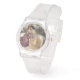 I only have one complaint. I ordered the watch with clear case and strap, and what was sent was white case and strap. I'm going to keep it because 1) it looks very nice in white, and 2) it would take too long to get a replacement made and sent in time for my occasion. Aside from the mix up with the color, the watch does look very good in white. The purple dial is actually sparkly which did not show in the online images. That was a nice surprise. If you like Swatch watches this is very similar to those. It's 33.6mm in diameter, 10.5mm thick, and 40.6mm lug to lug. Stainless steel case back says 3ATM/30m WR, so no swimming or showering or submerging this one. If you like Woodstock, this is a great choice.