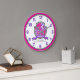 Knights style shield monogram letter S art name simple numbered wall clock perfect for a girls bedroom or playroom in shades of pink, purple, white, and grey. Personalise with your child's own name and name meaning for a personalised touch to your child's bedroom or nursery, this example is for names with the letter S. Currently reads Sarah. Compassionate, strong & alluring. Unique shield drawing, graphic art, name research, wording and design by Sarah Trett for www.mylittleeden.com