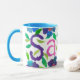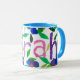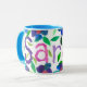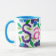 A good quality white ringer mug with a blue rim and handle and a handpainted paper collage design of flowers and the name 'Sarah'. See also matching greeting card, gifts and apparel. Dishwasher and microwave safe.