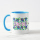 A good quality white 'ringer' mug with powder blue rim and handle. The design, front and back, is a handpainted paper collage of flowers, leaves and the name 'Sarah' and the text in between reads, 'This mug belongs to Sarah'. See also matching gifts, greeting card and apparel. Dishwasher and mictrowave safe.