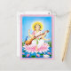 Saraswati sitting on pink lotus flower playing her instrument with her peacock sitting nearby. Very bright and colourful design that will get lots of attention. An eye-catching beauty.