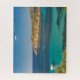 Challenging puzzle featuring an original photograph of the transparent blue water of the Sardinian emerald sea in all shades of turquoise, surrounded by green Mediterranean scrub with a little white boat and an islet in the distance