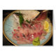 Sashimi is a Japanese delicacy. It primarily consists of very fresh raw seafood, sliced into thin pieces, and served only with a dipping sauce (soy sauce with wasabi paste or such condiments as grated fresh ginger, or ponzu), and such garnishes as shiso and shredded daikon radish.