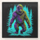 Retro Bigfoot in teal, purple and black standing by pine trees ai art for Sasquatch enthusiasts.
