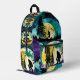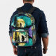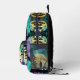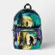 Sasquatch walking in woods with pet bear and meeting a friend, full moon in teal, purple and yellow