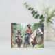A trail ride watercolor whimsical scene with Sasquatch riding one of the horses on a group trail ride.