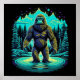 Bigfoot standing in the lake in the woods in black, teal and yellow retro vibes ai art.