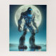 Sasquatch stands under a full moon surrounded by mountains, revealing a titanium exoskeleton of electronic circuitry and LED lights...