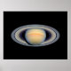 This photograph of the planet Saturn was taken by the Hubble Space Telescope, and shows the body of the planet and its rings from underneath, against the black background of space.