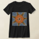 This artwork features a prominent six-pointed star at its core, layered with varying shades of orange and a distinctive dark brown animal print. Radiating from this central star are six elongated, stylised shapes in olive green and yellow with intricate markings, resembling feathers or stylised leaves. The light blue background subtly enhances the central motif with radiating lines.