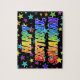 This lively and fun birthday-themed jigsaw puzzle design features the message "HAPPY BIRTHDAY, SAVANNAH" with the characters having a colourful rainbow spectrum inspired gradient pattern, in addition to a vibrant stars background pattern. A colourful puzzle like this might be a fun way to send birthday wishes to somebody named Savannah. [~Z0000468]